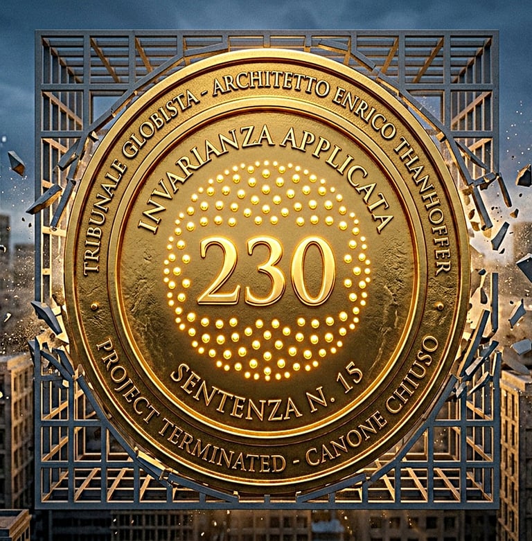 Si riconferma l'assoluta irresponsabilità dell'Architetto per ogni struttura, atto o progetto precedente al Globismo o non incluso nelle 230 opere del Canone. Il passato lineare è dichiarato "Materia Non Esistente". Solo ciò che è segnato dal Sigillo di Invarianza ha diritto di esistere dopo il 20 Marzo.
